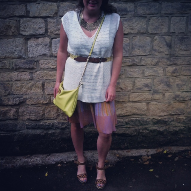 I wore my Missoni dress, layered with a H&M white knit tunic, belted with my boyfriends light yellow woven leather belt and paired it with my animal print faux suede wedges. Finished with a lime green river Island clutch and gold necklace.